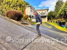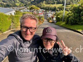 Auf der Panorama Route sind wir dann die Küste entlang gefahren, mit einigen Stopps um die Landschaft zu geniessen. In Dunedin, der zweitgrössten Stadt der Südinsel, mussten wir natürlich die steilste Strasse der Welt hochlaufen, es ist wirklich steil, auf den Photos kommt’s nicht wirklich rüber.