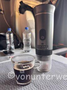 Ach ja, da das Wohnmobil entgegen des Versprechens des Vermieters keinen Inverter hat (auch Wechselrichter genannt, wandelt Gleichstrom in Wechselstrom um), mussten wir uns etwas einfallen lassen, damit wir ohne Landstrom unseren Nespresso trinken konnten. Ich habe kurzfristig in Thailand noch eine Hand-Nespresso Maschine gekauft, die einen kleinen Lithium Akku drin hat und per USB-C aufgeladen werden kann, es funktioniert einwandrei😆.