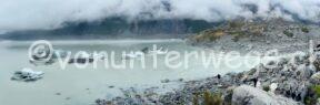 Via Cromwell, wo sich anscheinend die ganzen Früchteplantagen der Südinsel befinden, ging es zum Mount Cook/Aoraki (der höchste Berg NZ mit 3724m), den wir leider wegen schlechtem Wetter nicht wirklich gut zu Gesicht bekamen. Der Gletscherschwund ist auch hier gut zu sehen, wir konnten die Zunge sehen und einige abgebrochene Eisblöcke, die im kleinen See schwammen.