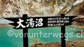 Am nächsten Tag stand der Besuch des Noboribetsu Jigokudani Valley auf dem Programm, ein spektakulärer Krater mit brodelnden Schwefelquellen, Fumarolen und Wanderwegen.