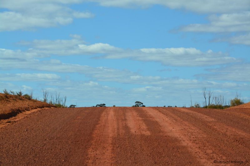 Etwa 35 Kilometer nach Hyden fing die erste Gravelroad an, zuerst haben wir ein wenig Luft aus allen 8 Rädern gelassen, anscheinend soll es weniger Plattfüsse geben und es ist angenehmer zu fahren.