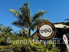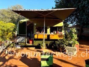 Von Johannesburg sind wir nach Victoria Falls in Simbabwe geflogen, haben unser Bungalow bezogen und danach einen Cappucchino in einem Wohnwagen Café getrunken, irgendwo in unserem Viertel.