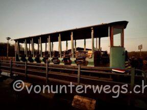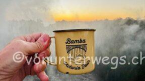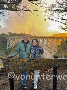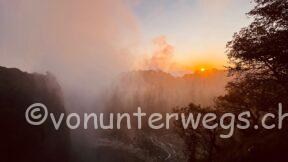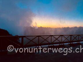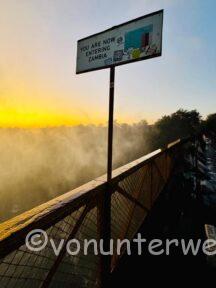 Früh am nächsten Morgen, es war noch stockdunkel, sind wir mit dem Bamba Tram auf die Brücke gefahren, welche Simbabwe und Zambia verbindet. Mitten auf der Brücke hat das Tram gestoppt und man kann die Fälle in der aufgehenden Sonne bestaunen.
