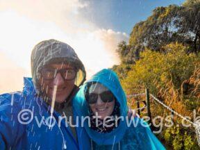 Auf dem Rückweg mit dem Tram, stiegen wir direkt beim Eingang zu den Wasserfällen aus und dachten, wir brauchen keine dieser blauen Regenpellerinen, wir hatten ja eine Regenjacke an. Am Eingang haben sie uns aber dringend geraten, wir sollten doch eine Pellerine mieten, was wir dann auch gemacht hatten, zum Glück.